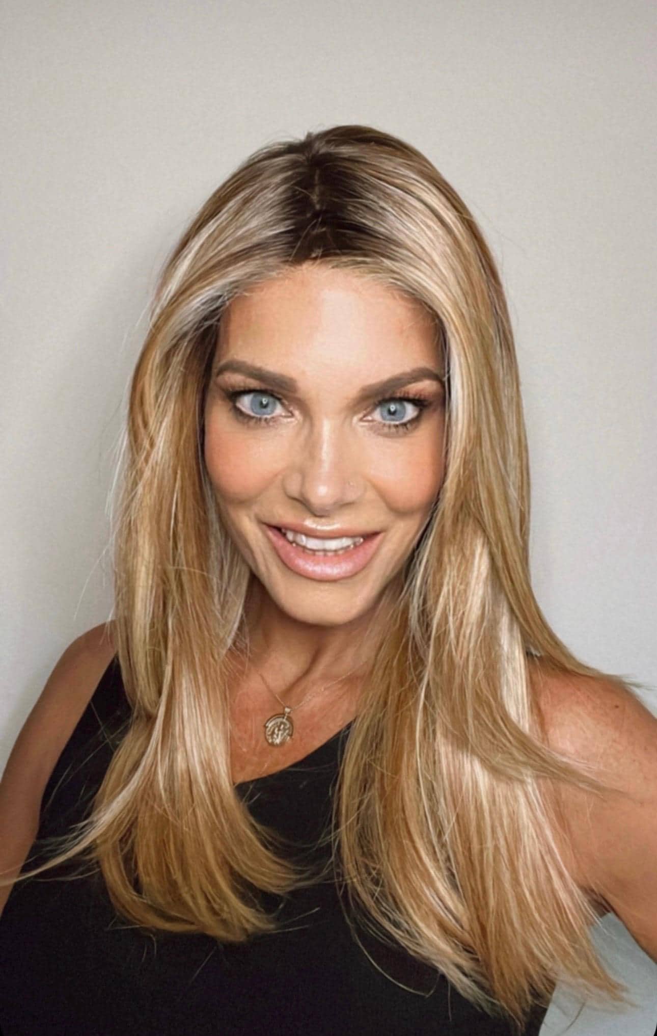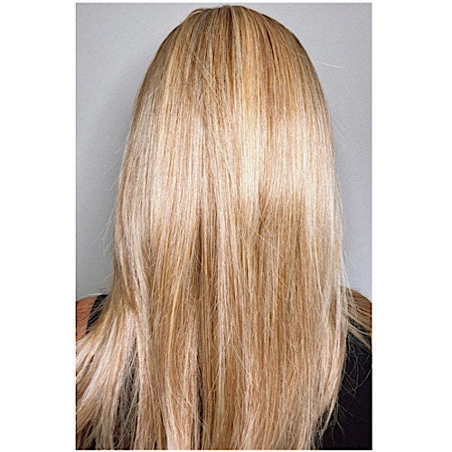 Remi is a gorgeous Warm Honey Blonde. At 21.5 inches in the center of the back, she offers an effortless relaxed look with swept curtain bangs and long flowing layers that fall just below the shoulders. A straight relax style. Very light density, feels like you have nothing on! Because of the light density, Remi is easy to pull back or put up into clips or even a low pony.